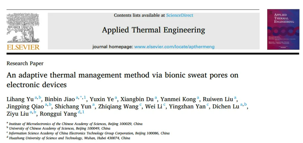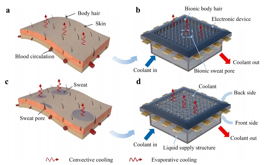 通过仿生汗孔进行出汗冷却的示意图 相比传统的微流散热结构,该冷板既能满足极端高功耗散热需求,又能在常规功耗下有效降低散热资源消耗,且自适应调控过程所需能量全部来源于芯片自身产热,无需消耗额外能量。实验表明,在芯片极端功耗工况下,自适应蒸发可提升80%的散热能力,使结温降低22.3℃。通过进一步优化蒸发区亲水性调节,排液控制及相变状态调控等工作,芯片在额定工作温度下功率密度可提升208W/cm2。 该研究成果以“n adaptive thermal management method via bionic sweat pores on electronic devices ”为题已发表在《Applied Thermal Engineering》。