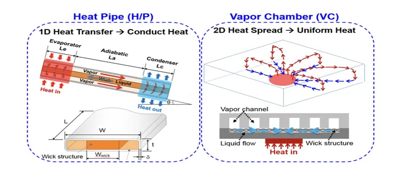 热管及均热板原理架构图对比(来源:JONES) VC均热板的局限性在于其制造成本相对较高,尤其是在复杂三维结构的设计和制作上。此外,均热板的散热能力在极高功率密度下可能依然存在限制,难以单独应对某些高热负载场景,通常需要与其他散热技术结合使用。