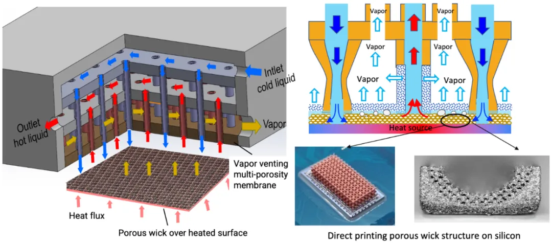 今年4月,中国科学院微电子研究所焦斌斌研究员团队在芯片自适应微流散热领域取得最新进展。 本研究提出一种自适应动态阈值散热方法取代传统恒定阈值散热方法。当芯片工作处于极端高功耗工况时,该方法利用仿生发汗行为,通过牺牲冷却工质提供额外散热能力。采用该方法制备的硅基微流冷板,可通过微通道强制对流实现的固定阈值及通过自适应蒸发实现的动态阈值,利用记忆合金温敏阀体结构控制“毛孔”开闭并调节工质在蒸发区内“蒸发汗液”,实现散热功率阈值的动态调控。