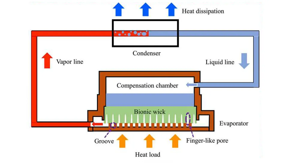 图源:中国科学技术大学 在这些有前景的解决方案中,研究人员目前正在研究仿生学——从大自然中汲取灵感——寻找最终可能彻底改变人工智能数据中心的创新技术。 中国科学技术大学叶宏教授领导的研究团队开发出一种用于环路热管 (LHP) 的突破性仿生陶瓷芯,其灵感来自叶片气孔的自然蒸腾过程。他们的研究发表在Langmuir上,解决了传统LHP的一个关键限制,即使用孔径均匀的芯,由于蒸汽阻塞和热阻增加,导致高热通量下的效率降低。 新开发的仿生灯芯具有非对称孔隙结构,通过克服这些挑战优化了热传递,为大功率芯片冷却提供了更有效的解决方案。 该设计模仿了叶片的气孔,直指状的孔隙充当蒸汽通道,大大降低了蒸汽传输阻力,增强了散热效果。这种结构可以实现更高的临界热通量,从而更好地管理高功率芯片的冷却。这些灯芯使用陶瓷代替金属,还提高了耐腐蚀性和热稳定性,这对于先进电子产品的长期性能至关重要。 生产工艺采用相转化流延成型技术,该技术通常用于生产多孔陶瓷膜。这种创新方法不仅能够一步创建所需的多尺度孔结构,还能确保输出稳定一致的产品。 LHP系统中仿生芯的初步测试已显示出良好的结果。通过优化毛细力和流动阻力之间的平衡,仿生芯可有效输送工作流体并提高系统的热性能。这一进步有可能扩展到计算硬件以外的领域,应用于航空航天、微电子和能源领域。 这种开创性的方法可以重新定义数据中心为人工智能提供动力的热管理策略,为受自然界启发的更高效、更可持续的解决方案铺平道路。研究人员希望,这些仿生结构的持续开发和改造将有助于克服现有的挑战,并满足下一代电子产品的需求。