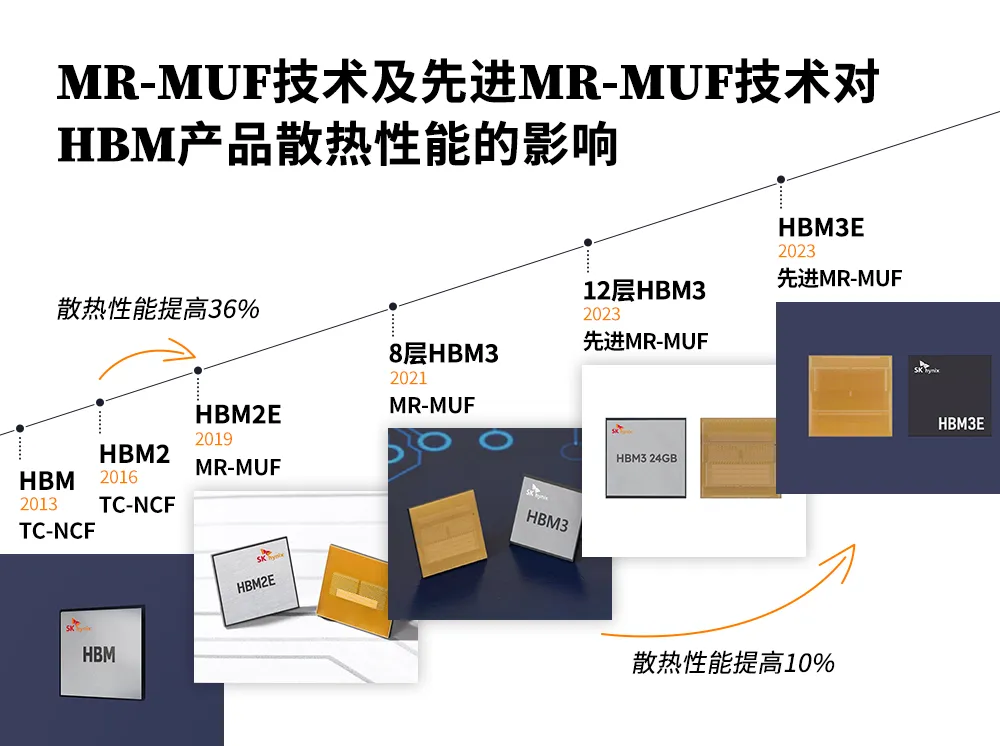 TC-NCF技术与MR-MUF技术散热性能的结构差异 MR-MUF技术能够同时对HBM产品中所有的垂直堆叠芯片进行加热和互联,比堆叠芯片后填充薄膜材料的TC-NCF技术更高效。此外,与TC-NCF技术相比,MR-MUF技术可将有效散热的热虚设凸块数量增加四倍。 MR-MUF技术另一个重要特性是采用了一种名为环氧树脂模塑料(EMC, Epoxy Molding Compound)的保护材料,用于填充芯片间的空隙。EMC是一种热固性聚合物,具有卓越的机械性、电气绝缘性及耐热性,能够满足对高环境可靠性和芯片翘曲控制的需求。由于应用了MR-MUF技术,HBM2E的散热性能比上一代HBM2提高了36%。 此后,MR-MUF技术持续升级迭代,引入了业界首创的芯片控制技术(Chip Control Technology)和改善散热效果的新型保护材料。在此过程中,因其在先进MR-MUF技术中应用的新型EMC与原始MR-MUF技术中的EMC相比,使散热性能提高了1.6倍,SK海力士再次实现材料创新。